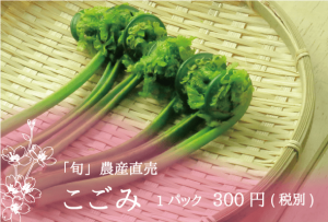「旬」農産直売_こごみ_1パック300円(税別)