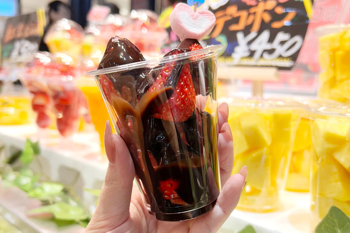 新鮮なイチゴにチョコソースや練乳をたっぷりトッピング♪