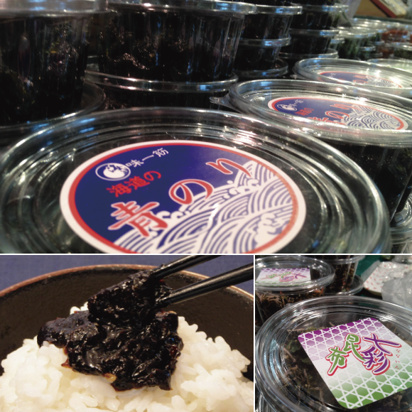 青のりをはじめ、わさびのり、いかの塩辛はもちろんですが、大変ご好評いただいている「七彩昆布」がおすすめです。