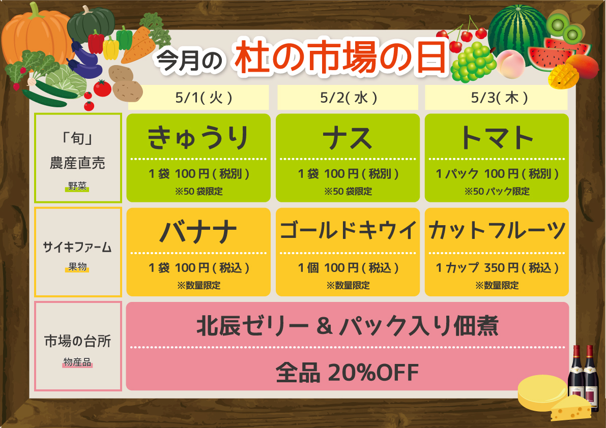 5月1日(火)~5月3日(木)の3日間、「杜の市場の日」を開催いたします! 3日間限定のお買い得品が満載です!ぜひ足をお運びください!