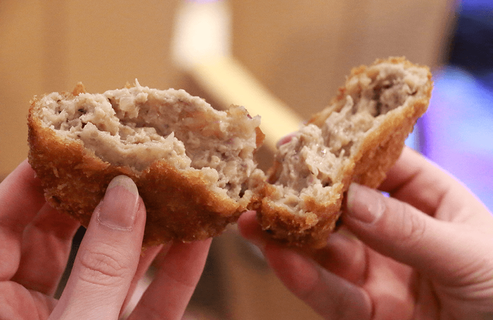 宮城県産の豚肉・鶏肉を使用しているシンプルな味付けのメンチカツは、肉の旨みが感じられ、噛むたびに肉汁が溢れ出してとってもジューシー。