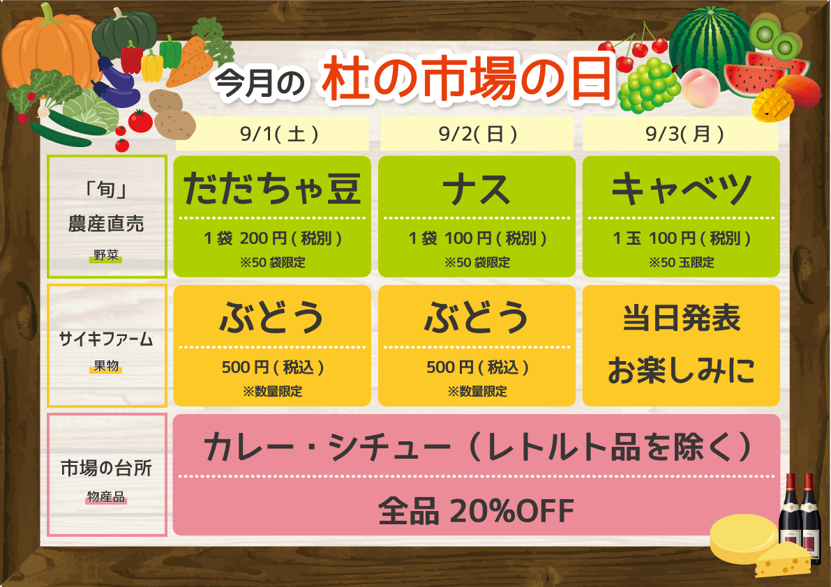 9月1日(土)~9月3日(月)の3日間、「杜の市場の日」を開催いたします! 3日間限定のお買い得品が満載です!ぜひ足をお運びください!