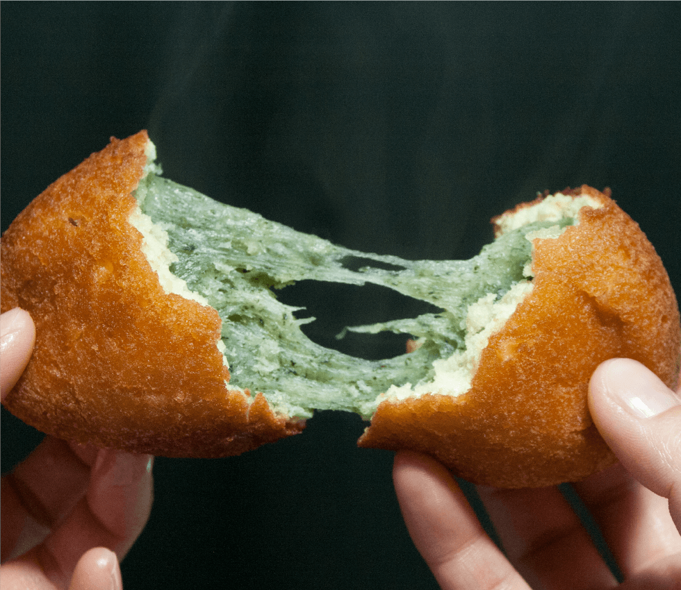 外はカリカリ・中はふんわりの生地と、もっちり食感のよもぎ餅が合わさり、一口でカリッ!フワッ!もっちり~が味わえます。