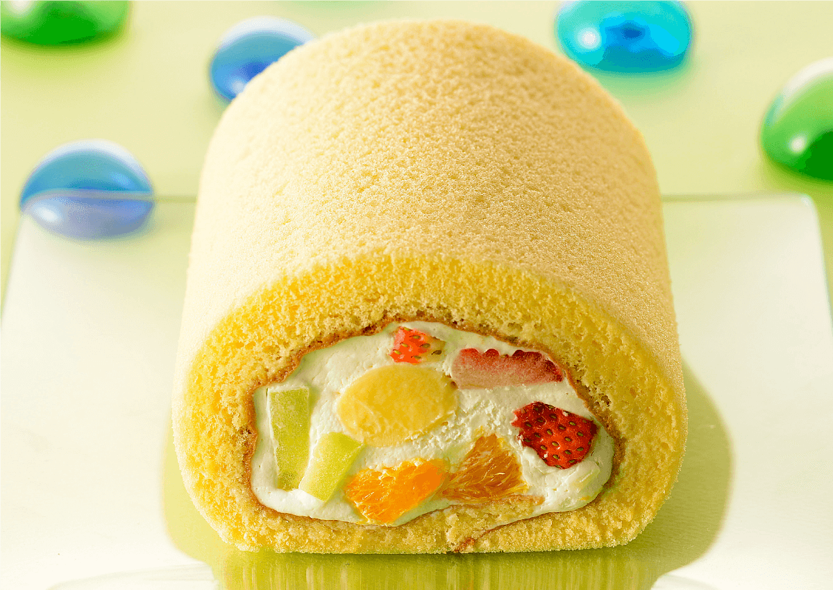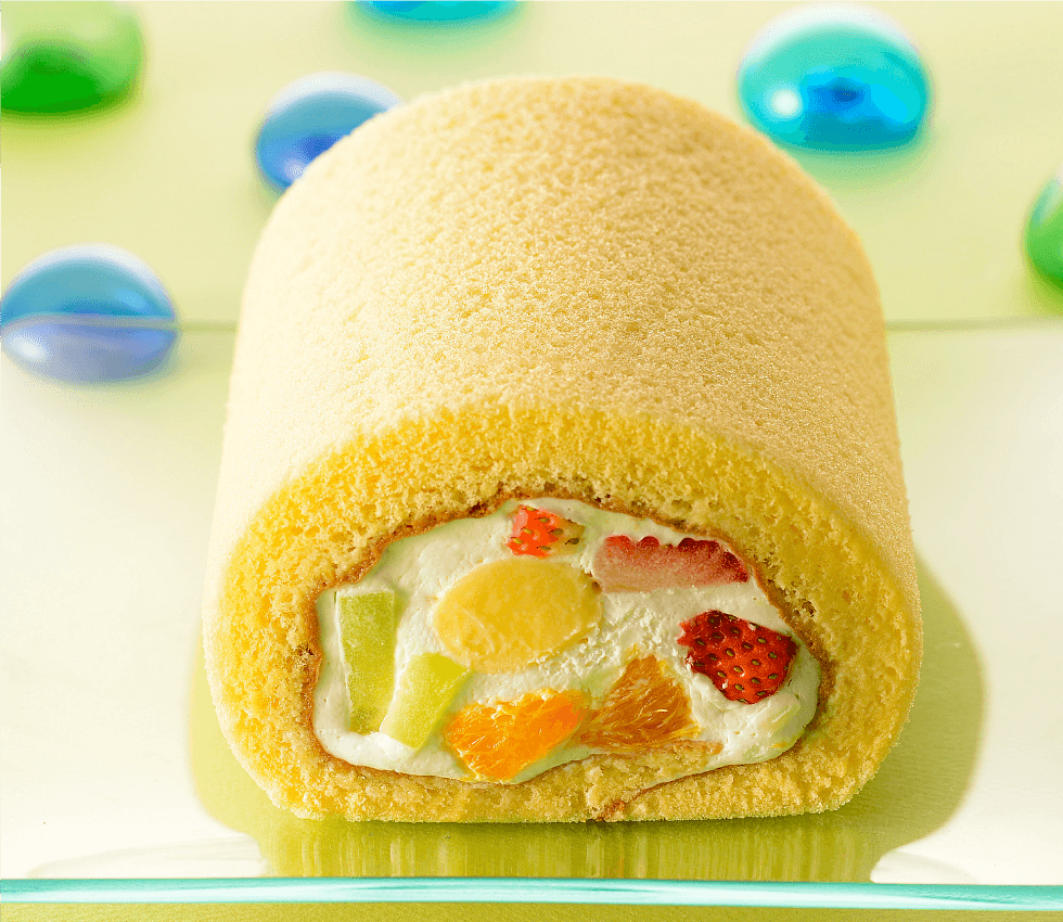 イチゴ・メロン・オレンジ、たまご舎自慢の特製生クリーム、特製カスタードをぐるぐる巻いた、大人気のロールケーキです。