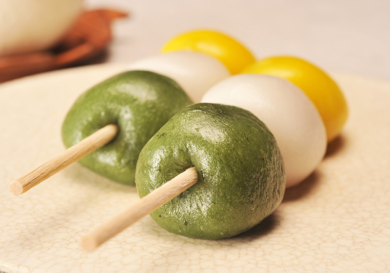 国産うるち米を使用し、質のいい粉ができる「胴搗き製粉」で仕上げた生地で3つの異なるあんが包まれたおだんご。