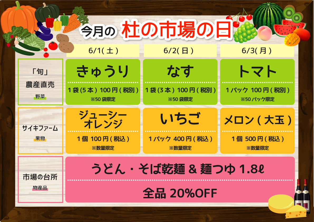 6月1日(土)~6月3日(月)の3日間、「杜の市場の日」を開催いたします! 3日間限定のお買い得品が満載です!ぜひ足をお運びください!
