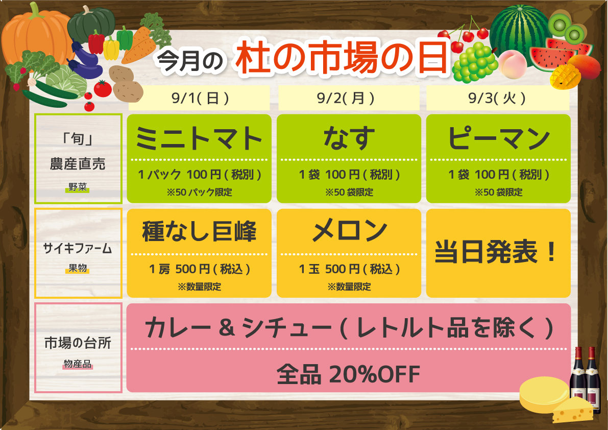 9月1日(日)~9月3日(火)の3日間、「杜の市場の日」を開催いたします! 3日間限定のお買い得品が満載です!ぜひ足をお運びください!