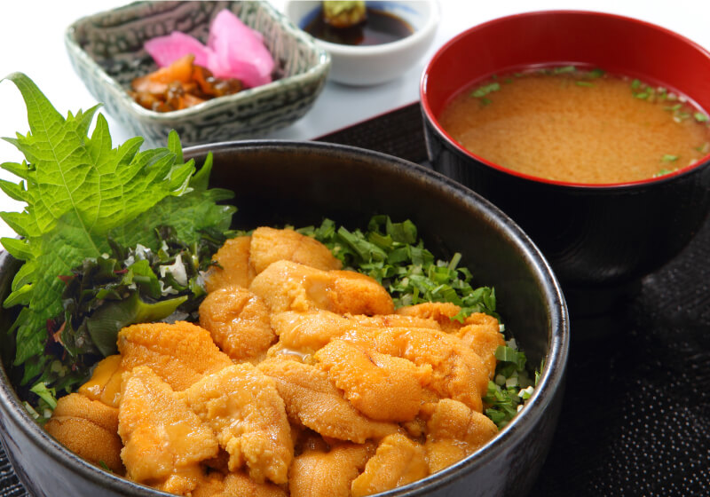 片倉商店の看板商品「生うに丼」に使われるウニは、石巻・金華山の漁場で社長が自ら朝獲りしたものだけを使用しています。