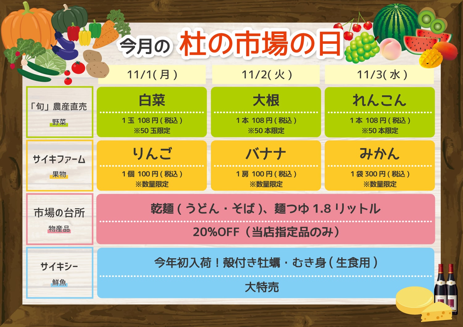 11月1日(月)〜11月3日(水)の3日間、「杜の市場の日」を開催いたします! 3日間限定のお買い得品が満載です!ぜひ足をお運びください!