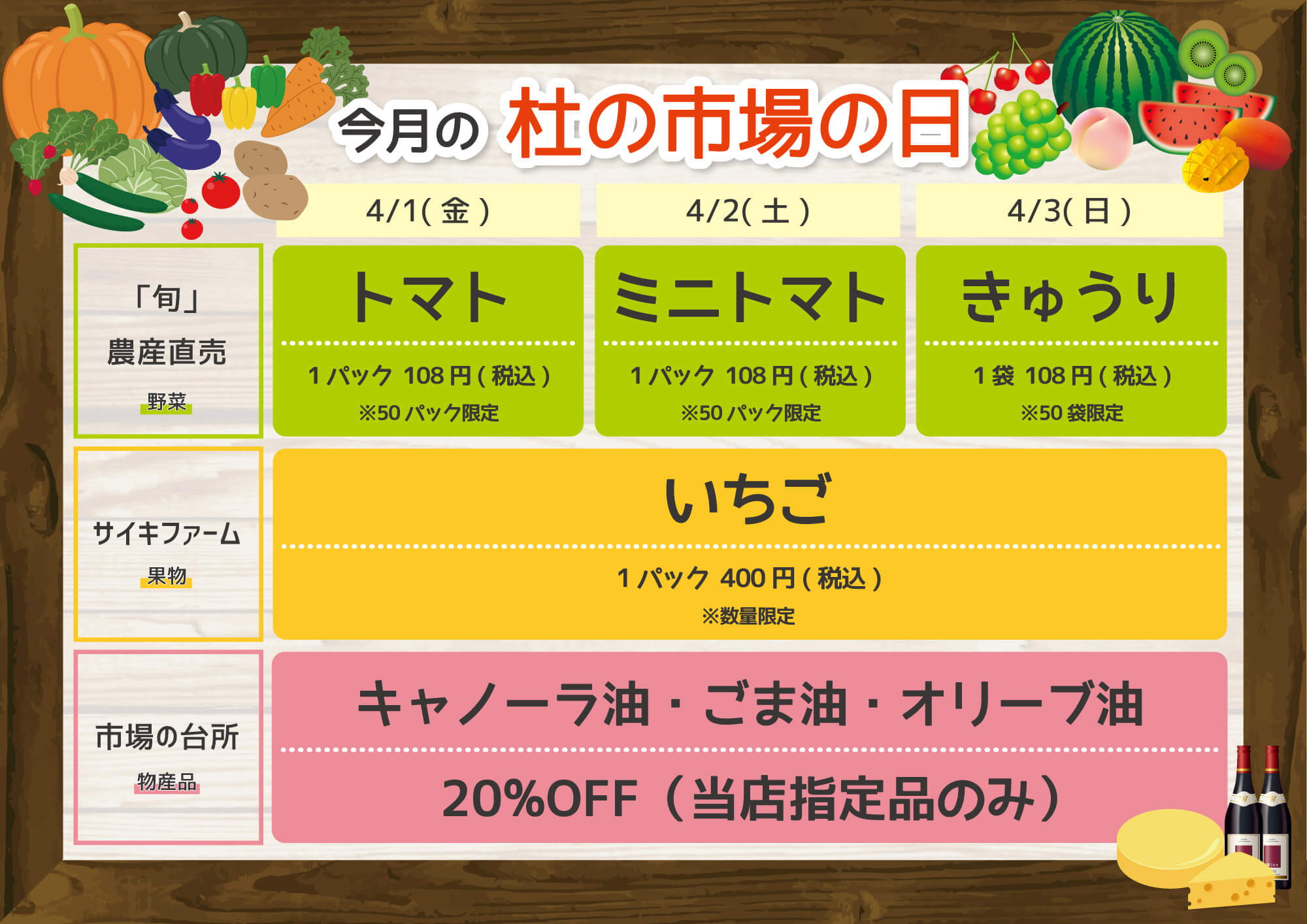 4月1日(金)〜4月3日(日)の3日間、「杜の市場の日」を開催いたします! 3日間限定のお買い得品が満載です!ぜひ足をお運びください!