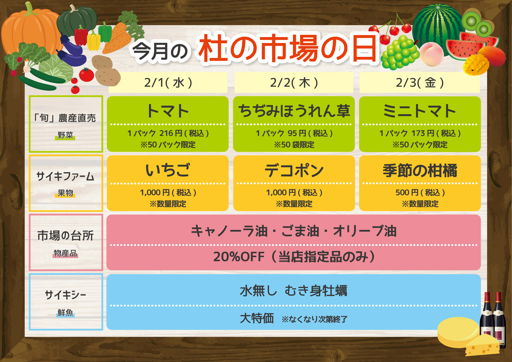 2月1日(水)〜2月3日(金)の3日間、「杜の市場の日」を開催いたします! 3日間限定のお買い得品が満載です!ぜひ足をお運びください!