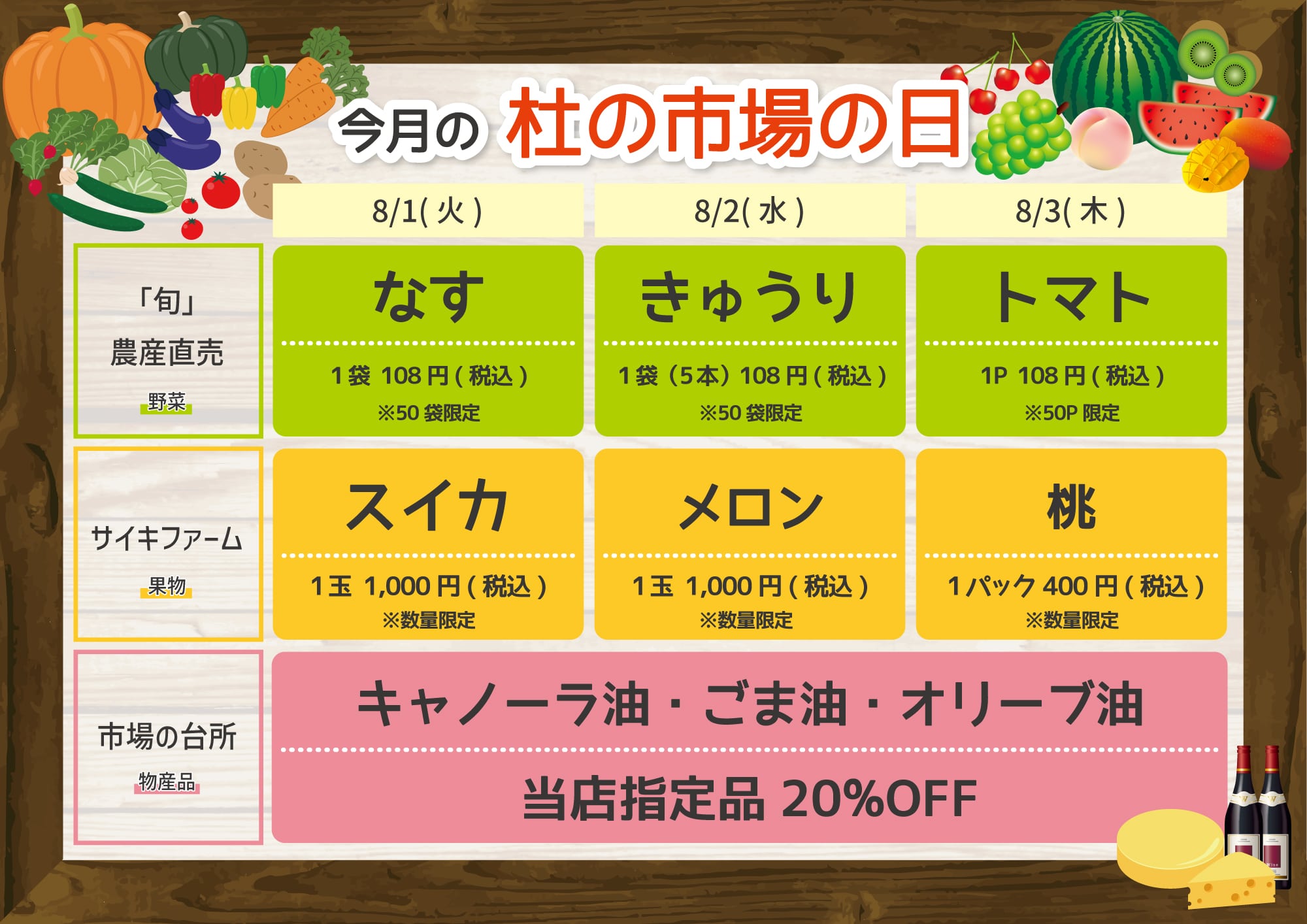 8月1日(火)〜8月3日(木)の3日間、「杜の市場の日」を開催いたします! 3日間限定のお買い得品が満載です!ぜひ足をお運びください!