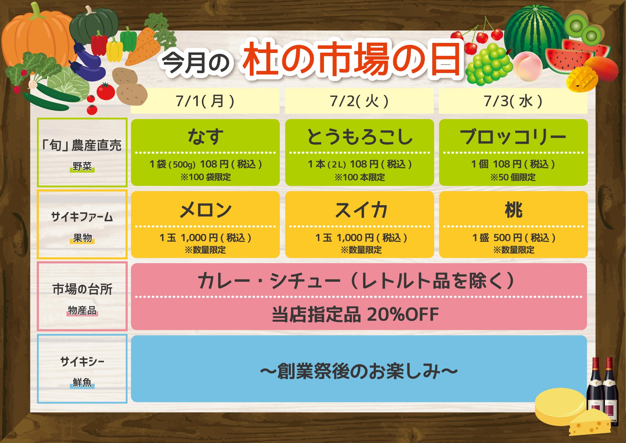 7月1日(月)〜7月3日(水)の3日間、「杜の市場の日」を開催いたします! 3日間限定のお買い得品が満載です!ぜひ足をお運びください!
